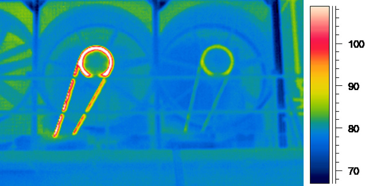 Nice example of fan belt – drive of process cooling tower fan in pre-failure mode. The heat is cause by an increase in friction. Belt drive could be too tight, too loose or pulleys misaligned. Further investigation can find problem and correct before failure unexpectedly occurs.